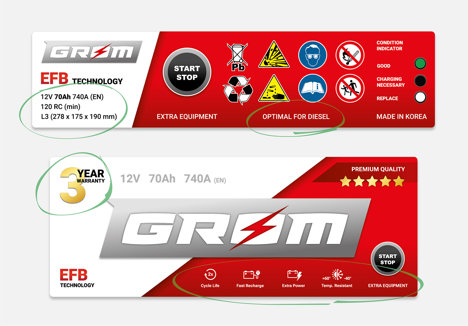 Grom to marka akumulatorów, które przewyższają jakością produkty konkurencji w tym samym segmencie cenowym. Dotychczasowy projekt etykiet był przestarzały i niespójny stylistycznie.